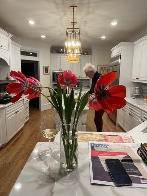 Meanwhile, we are starting to have the last dinner parties, movie nights, and gatherings for drinks here, where I’ve loved the big windows in the living room that fills with light in early afternoon, the attic that looks like a small cathedral in progress, the tiny room for flower arranging, miles of bookshelves, our bedroom also flooded with sunlight, and the woods out back where herds of deer gather to munch, and at night the coyotes frolic and howl.