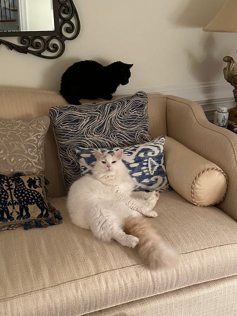 Fitz and SonnyMan already know something is afoot. What they have no way of knowing is that they are moving to Italy. They’ve endured the vet trip, checking for shots and tags. They yowled and drooled all the way there, which makes us know the flight is not going to be fun for them at all. Fitz, the white Turkish Van cat, is, at 21 pounds, too big to fly coach, and only service animals are allowed in business. Fortunately, cargo for animals has improved a lot since many now are traveling with pets. Large carriers are required and they will have room to move around, plus little cups, like in canary cages, for food and water. Still, a nightmare no doubt, but once in Italy, I know they will love living at Bramasole, where they can roam among the olive trees and snooze in beds of lavender and roses. Fitz is incredibly sociable and soon will be dropping by our neighbors for a pet and a snack. Sonny will lounge at home, with many prime places to view the goings on around the garden.