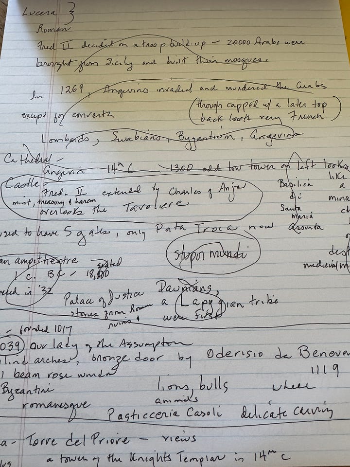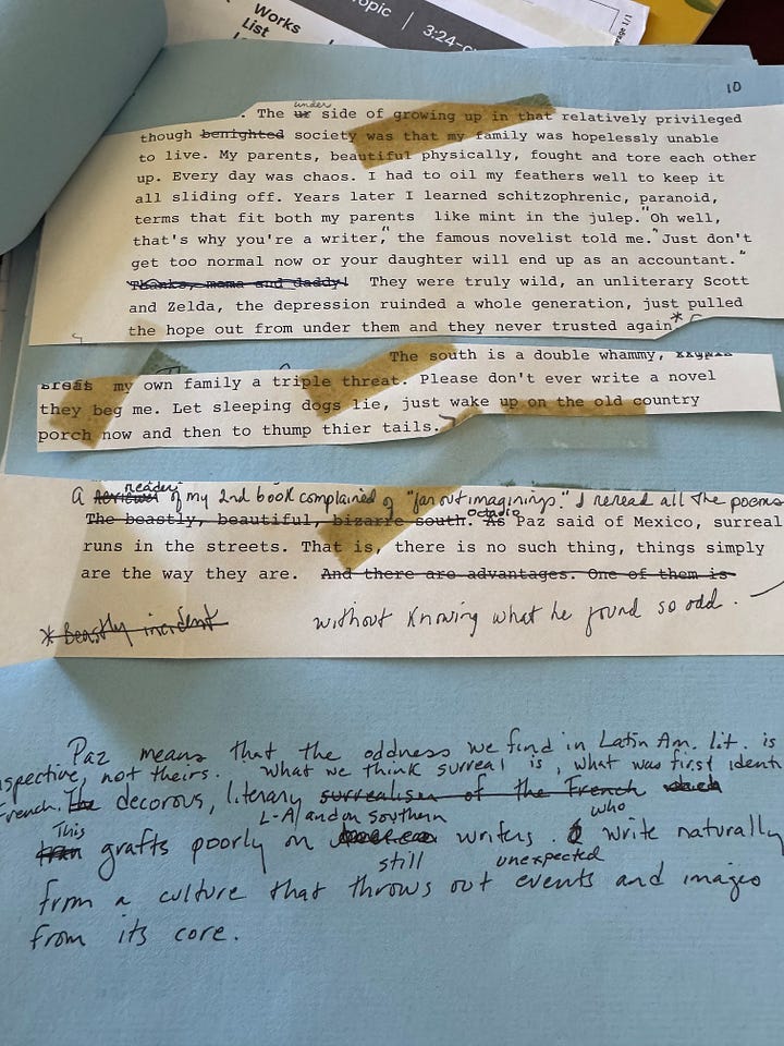 I am about to sign a contract for a new book of memoir/essays on writing and the pilgrimages I am making. Now, it seems exciting to me to go back to my early methods and to see if they make a difference. This kind of book is all voice. Does ink provide a better link to an imagist, synesthetic, intuitive way of thinking? Are my handwritten scrawls, cut-and-paste slips, and jottings more spontaneous than straight computer writing? It certainly looks like more fun. To that end, I have acquired a pristine blue notebook for ideas, words, book lists, and a large, lineless one for actual writing. I’m very excited to move backwards into this project.