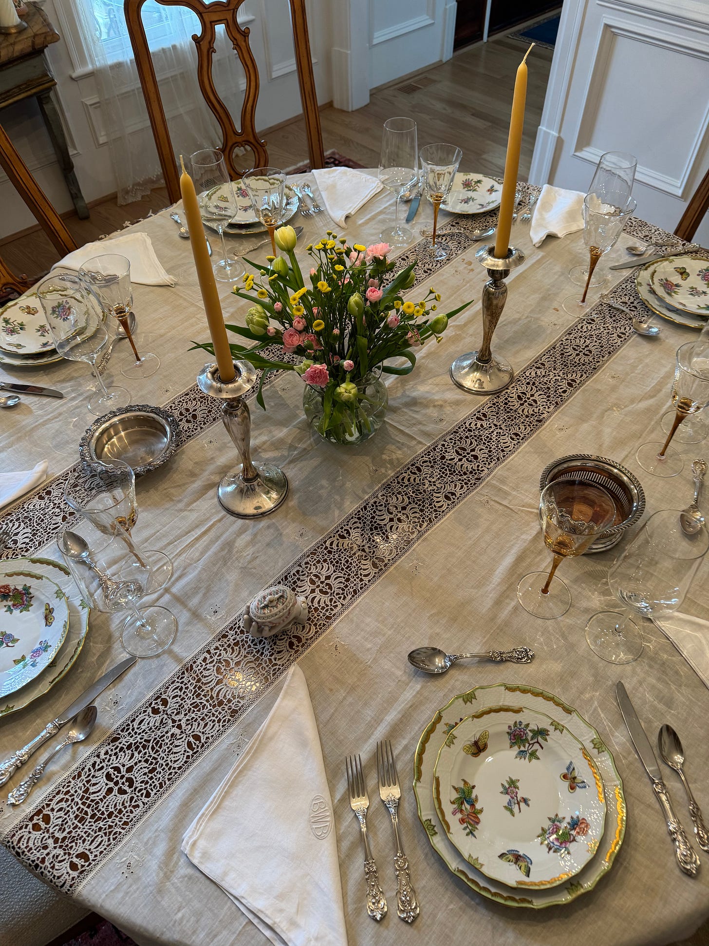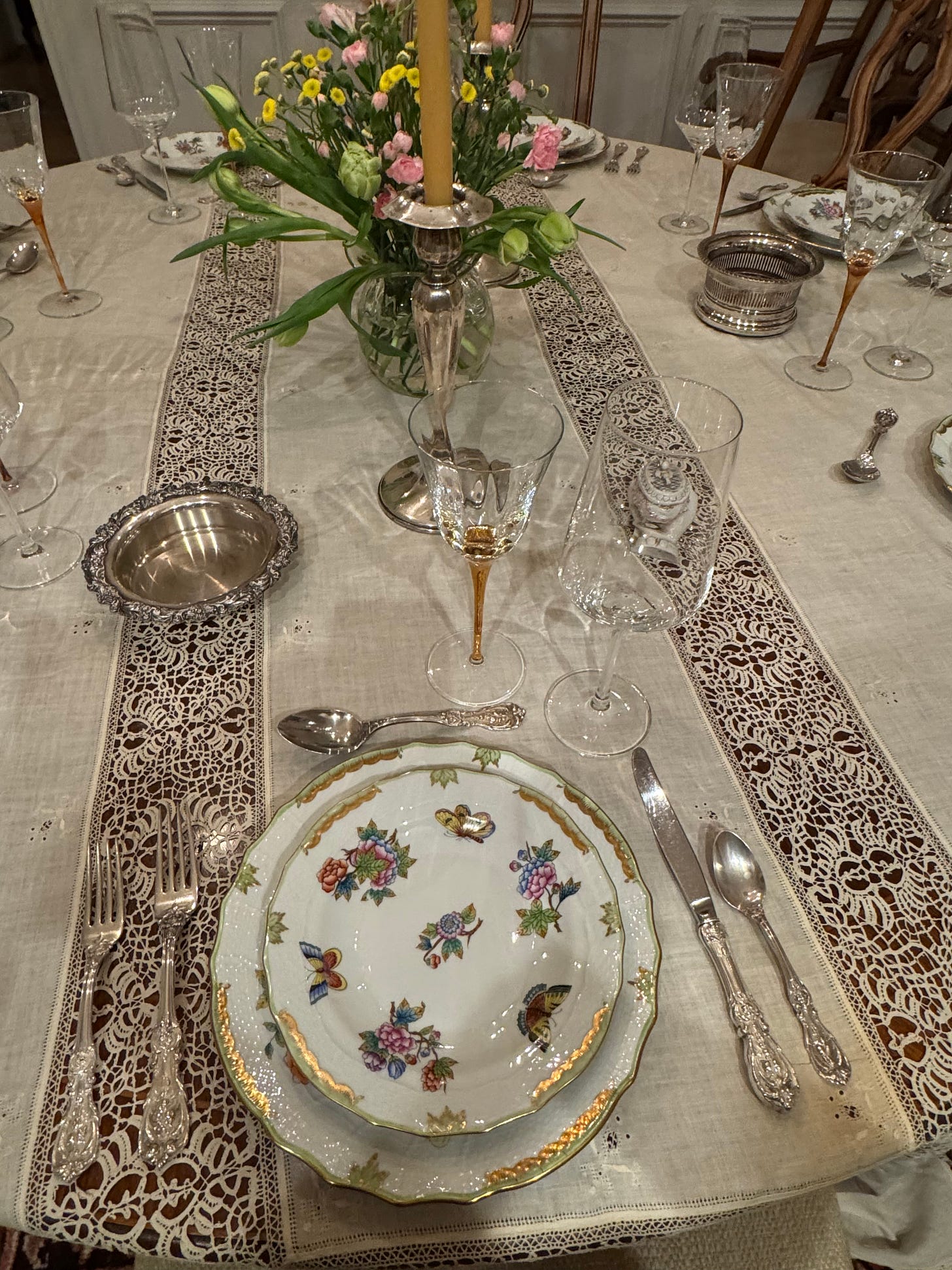 Another Hungarian here in Marin. I love the reference to Herend china - it is gorgeous. I have a few pieces. We also use our silver - why not? I say life is short use your silver and wear your jewelry. Your table is perfect - lots of memories there. Isn't it funny that the big beautiful tablecloths always have a story to tell! We are just the 2 of us this year so fat roasted chicken thighs with my mom's stuffing and garnet yams with brown sugar and bourbon. Wishing you a wonderful holiday - now and through the New Year.