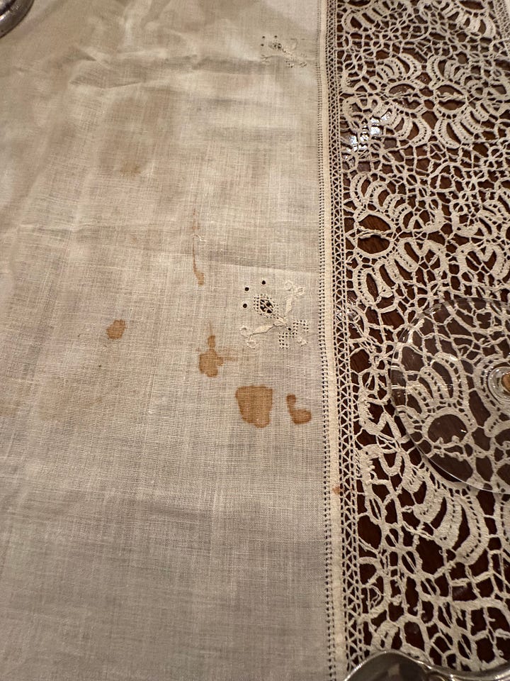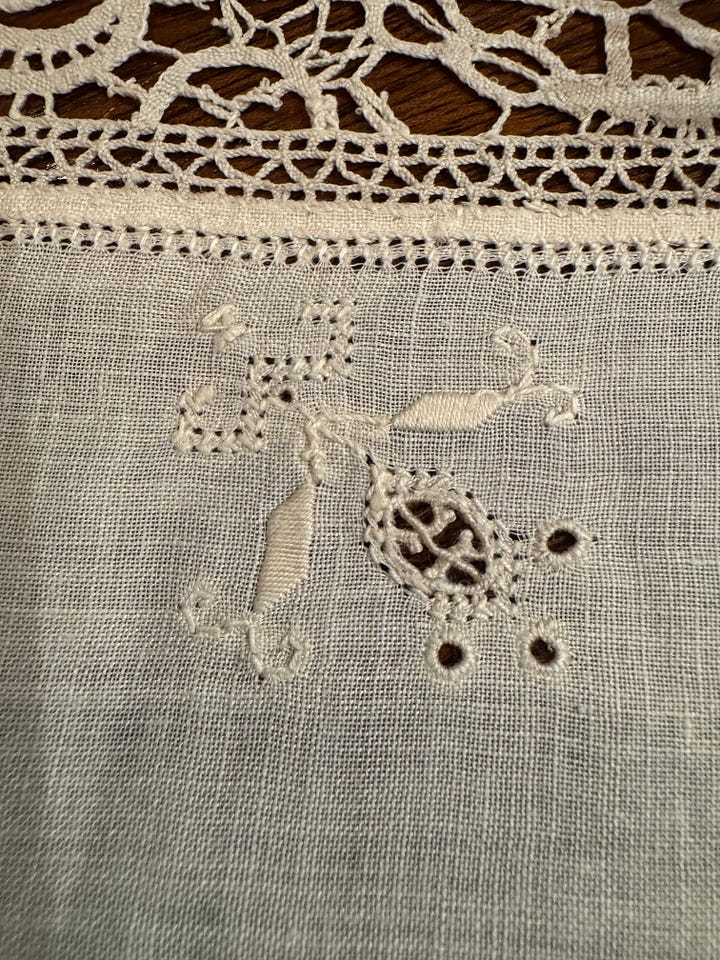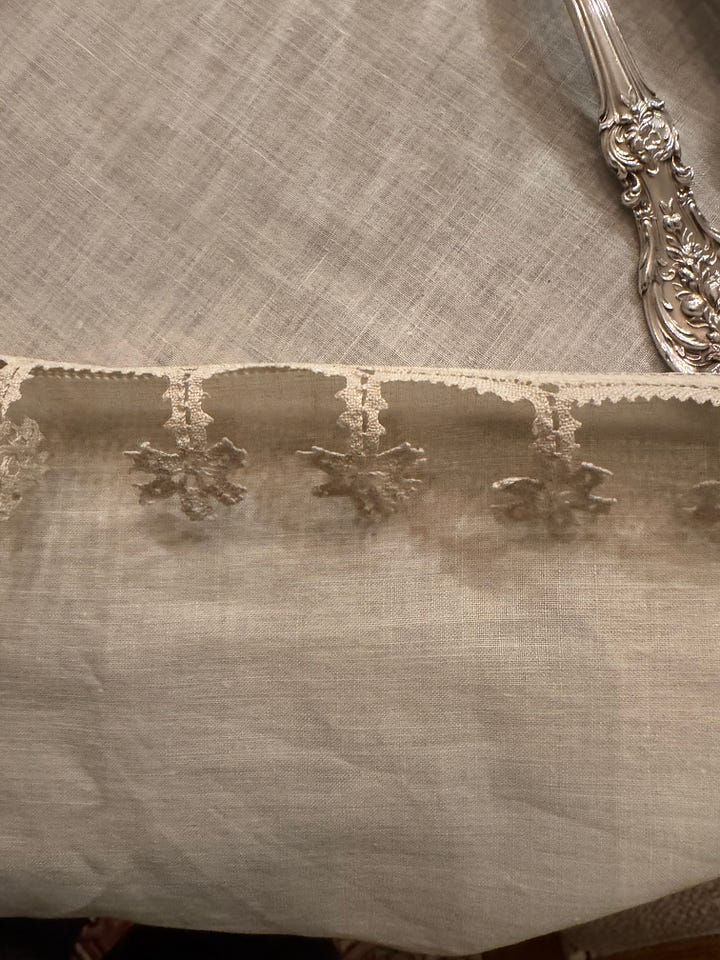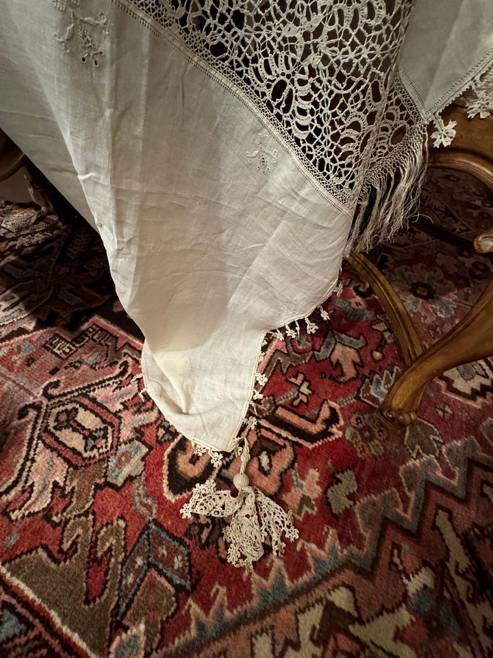 In Mrs. S’s dining room, I found a very old, quite fine linen tablecloth with embroidery that must have put out the eyes of the maker, lace panels, tiny flowered borders, and big tassels. A work of art. I chose that.