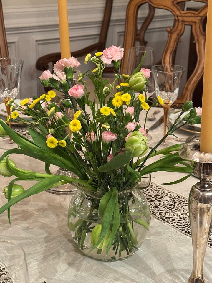 Today I spread it across the table and found that it almost fit—just lacking an inch or so. It has a few small spots, some long ago dribble of port or a slosh from a toast of an old Burgundy. I set the table with the gorgeous Herend from my family—my daughter’s pattern, and also the pattern of my two sisters. How long have I collected linens? I took a stack of huge old monogrammed napkins and the silver I’ve used every day of my grown-up life. (Yes, it always has gone in the dishwasher.) At Trader Joe’s I selected flowers in the colors of the china. Thanksgiving is more about memory than about the big bird brought in aloft. The candlesticks, my mother’s, the salt cellar in the shape of a hand, from my friend Ann, now gone, the platters collected from Italy, the water goblets a gift from my friend Susan—so many invisible ones also have a place at the table.