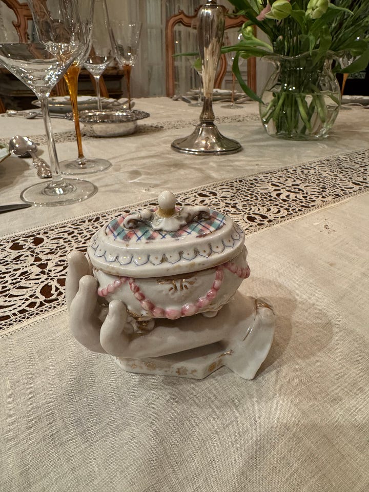 I love setting the table. This year, no mums, no pumpkins, or colorful leaves. The plain white linen and the Indian paisley in fall colors will stay in the drawer because I found in the bottom a folded treasure given to me years ago by a friend who was emptying her mother-in-law’s huge house. She gathered some friends and said to take what we wanted. The mother-in-law was a Duke, very big name in these parts. She had some cool old furs and coats, evening gowns and purses. Even the men got into it, coming out of the attic with suits from the fifties, great Panama hats, and big wooly sweaters, some with moth holes. We had a fun day and ended with a big supper in the grand dining room, the last event of that family in the old house.